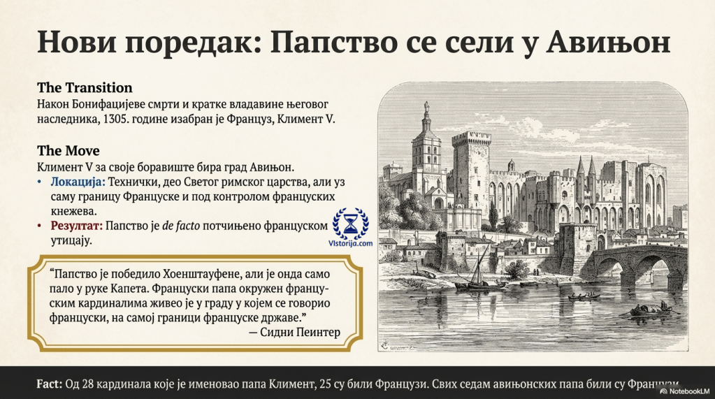 „Папство је победило Хоенштауфене [владали Светим римским царством немачког народа], али је онда само пало у руке Капета [владали Француском од 987. до 1328. године]. Француски папа окружен француским кардиналима живео је у граду у којем се говорио француски, на самој граници француске државе.“