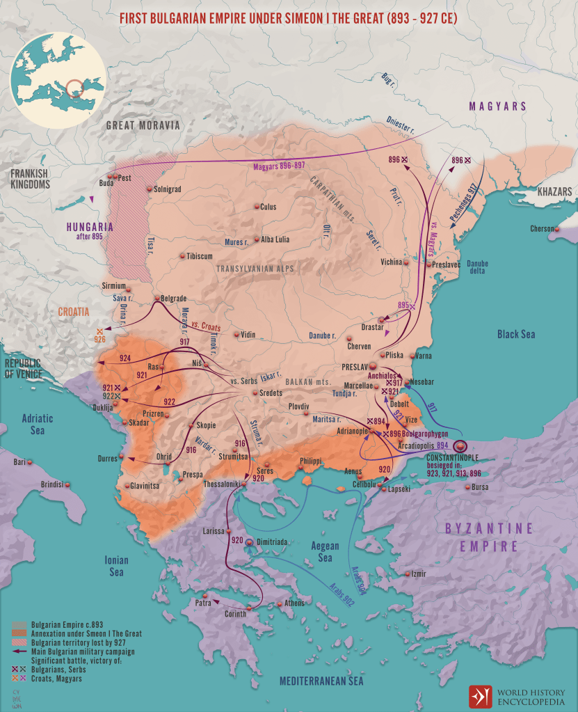 Након сукоба са моћним суседима, Бугарска је постала треће европско царство. После освајања грчких земаљa до Коринта, Симеон (893-927) се за цара Бугара и Ромеја (Римљана) прогласио 913. године. Бугари су опседали Цариград те 913. године и деценију касније – 923. године. Пошто Симеон није успео да освоји Цариград, прихватио је компромисно решење, по којем је Византија признала његову царску власт, али се она односила само на бугарске земље. Престоница је постао град Преслав. Уведен је словенски језик и у књижевност и замењена глагољица ћирилицом. Прво бугарско царство је уништено 971. године од стране Руса, који су позвани да помогну Византији.