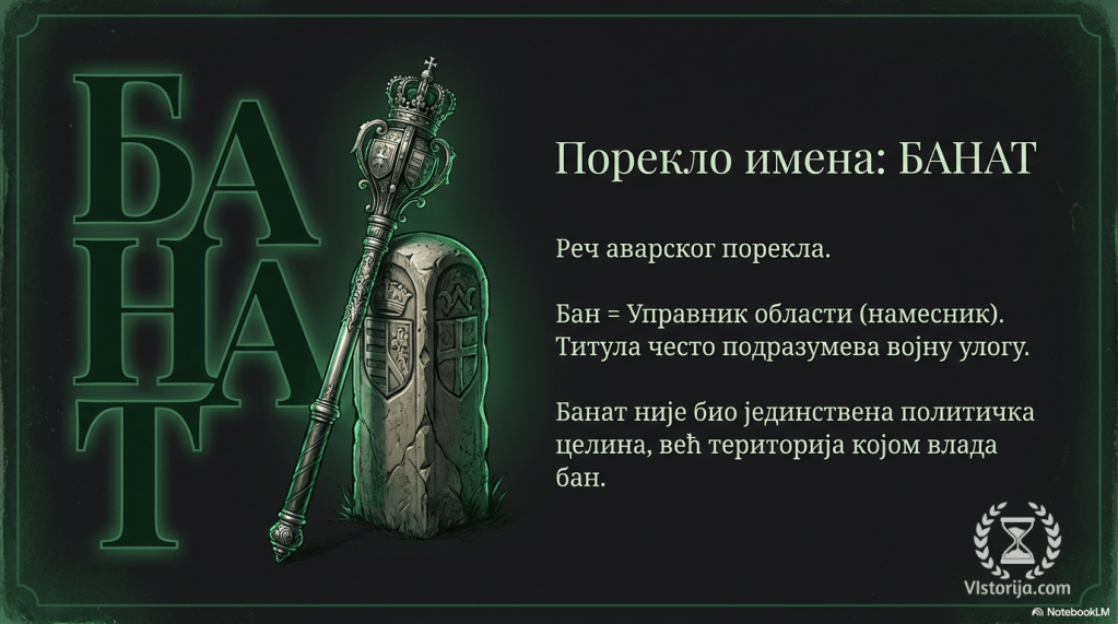 „Банат је географска област која се данас налази у Румунији (највећи део), Србији и Мађарској (најмањи део). Тај простор током историје није чинио јединствену политичку целину. Њиме су владали разни народи. Банат је био територија којом је владао бан, управник поједине области, обично постављен од централне власти (као намесник), често са војном улогом (војводе). Титулу бана носио је касније и заменик мађарског краља у Хрватској. Порекло назива је аварско.