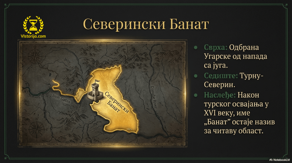 Међу ове бановине спада, такође, обновљени Северински Банат, који је обухватао Малу Влашку (Олтенију, у југозападној Румунији) са седиштем у Турну-Северину. Бан овог баната био је често уједно управитељ јужноугарских жупанија између Мориша, Тисе, доњег Дунава и трансилванских планина. Због тога се назив Северинског баната проширио и на њихову територију. А када је Северински банат турским освајањем [у 16. веку] престао да постоји, назив Банат се ограничио на тле ових жупанија, и тај назив у том значењу сачувао се до данас.“