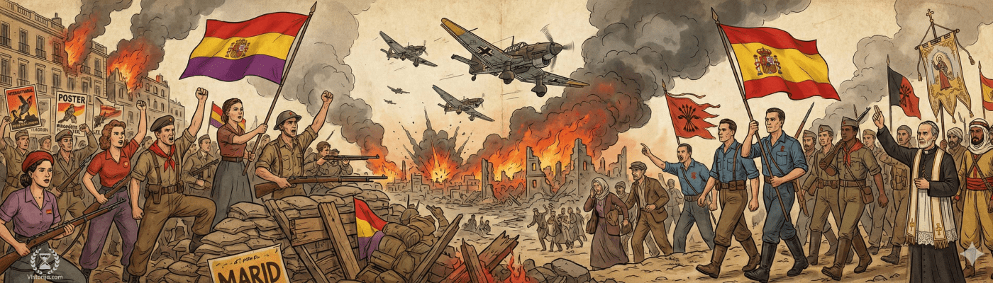 Грађански рат је отпочео побуном националиста и дела војске (предвођене Франком, којег је претходно власт сменила са места начелника генералштаба и преместила на место војног заповедника на Канарским острвима) против републиканске власти након победе левичара на изборима 1936. године. Победа је била веома тесна (47% за левичарске коалиције Народног фронта наспрам 46,5% за националистичке опције) и сведочила је о дубокој подељености шпанског друштва.
