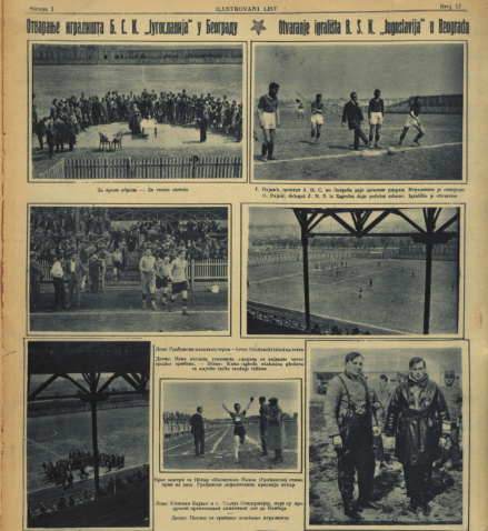 „Данас по подне, са почетком у 3 часа и 45 минута, одржаће се на игралишту „Југославије“ првенствена утакмица између лоптачког првака Београда и Б.Л. Подсавеза „Југославије“ и Б.С. Клуба.