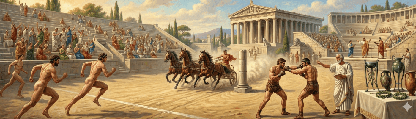 Најчувеније надметање Хелена одвијало се сваке четврте године у Олимпији, у области Елида на полуострву Пелопонез. Олимпија у то време није била град, као данас, него само свештено место посвећено врховном богу Зевсу,