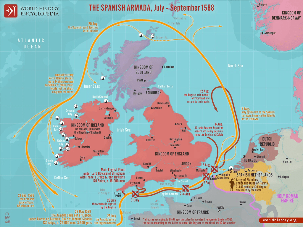 У XVI веку Енглеском је владала династија Тјудор, из које је најзначајнији био краљ Хенри VIII, који је енглеску цркву одвојио од Рима, због недобијања дозволе да се разведе од прве жене, шпанске принцезе Катарине. Она је била тетка у том веку најмоћнијег владара не само Шпаније – краља Карлоса, односно цара Карла V. Он је имао сина Филипа. Хенри се од шпанске принцезе раставио да би добио сина, што је успео тек у трећем браку. Тај син Едвард је енглеску англиканску цркву учинио протестанстском (његов отац ју је само одвојио од Рима и одредио да је њен поглавар краљ Енглеске, што је опстало до данас). Едвард је кратко владао, па га је наследила полусестра Марија (Хенријева ћерка из првог брака). Она се удала за Карловог сина Филипа II.