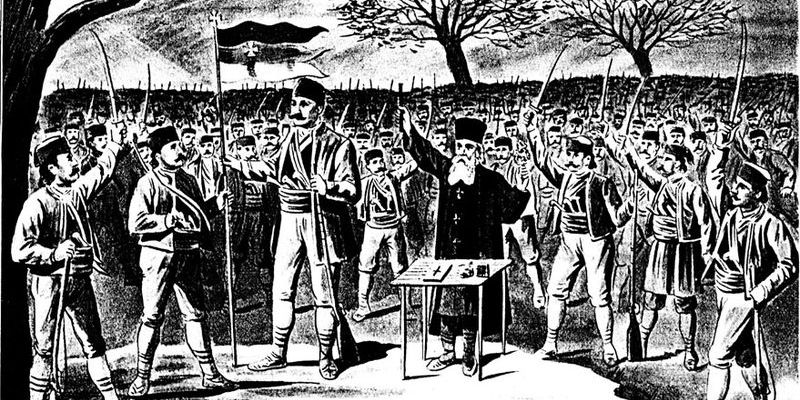 „Шумски збегови дали су прве устаничке одреде, којима су се прикључиле хајдучке чете. Кнезови, у одбрани голог живота, састали су се 2/14. фебруара у шумадијском селу Орашцу, крај Тополе, и донели одлуку да започну устанак. На чело покрета ставио се Ђорђе Петровић-Карађорђе, некадашњи добровољац у аустријској војсци, свињарски трговац и одметник од турске власти. Устанак је веома брзо захватио цео Београдски пашалук, што због ранијих припрема, што због несносног стања. Мањина која се колебала увучена је у устанак силом. Дигла се сељачка војска, наоружана хајдучким оружјем заплењеним од Турака, пушкама кришом набављеним у Аустрији, ножевима, вилама и косама. Масовни прилаз устанку надокнадио је недостатак припрема и војне спреме.“
