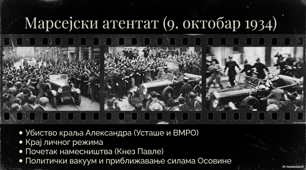 Краљ Александар Карађорђевић (регент до смрти краља Петра 1921. године) убијен је 9. октобра 1934. у Марсеју од стране националистичких сепаратиста – хрватских усташа и бугарске ВМРО (Унутрашња македонска револуционарна организација).