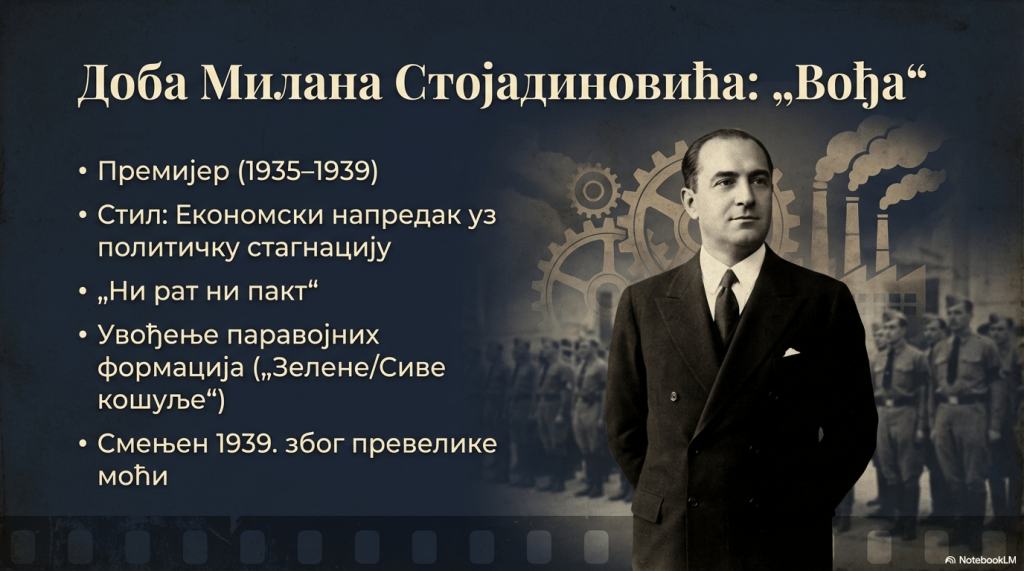 „Иако је медијски стварао слику о великим достигнућима своје политике, понајвише захваљујући видном напретку у индустријализацији земље и градитељству, вријеме Милана Стојадиновића није донијело преко потребну политичку стабилизацију крхкој југословенској држави. На унутрашњем плану, одбијајући да преговара са њима, само је појачао незадовољство Хрвата, а за стабилизацију прилика није му била довољна државна репресија. Самосталност у вођењу државних послова и тежња да постане југословенски „вођа“, чинили су га превише опасним по кнеза-намјесника, због чега га је овај све више гледао са неповјерењем. Диктаторске склоности, ословљавање са „вођо“ и одреди партијске паравојске, популарно називани „сивим кошуљама“, давали су суморно обиљежје његове вишегодишње власти. Без амбиције да се то на било који начин оправда, треба напоменути да се радило о познатим појавама у тадашњој европској политици. У више европских држава у међуратном периоду успостављене су диктатуре различитог типа, а партијске паравојске су биле саставни дио таквих режима. Штавише, гледајући цјелокупну ситуацију у Југославији, „сиве кошуље“ Милана Стојадиновића нису се много разликовале од „фантова“ Антона Корошца или Хрватске сељачке заштите (ХСЗ) и Хрватске грађанске заштите (ХГЗ) Владка Мачека.