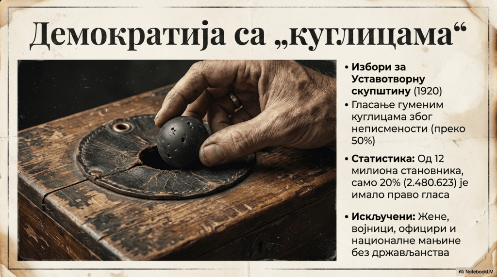 „Званично, влада је увођење општег изборног права образложила разлозима – „што је народ у току рата показао своју високу свест и пожртвовање, чиме је стекао право да му се досадашња политичка права прошире“. Међутим, прокламовано опште бирачко право имало је знатна ограничења. Бирачко право нису добиле жене. Бирачко право нису имали ни припадници националних мањина који су по међународном Уговору о заштити мањина имали право опције за своје матичне земље, тзв. оптанти. Ово ограничење обухватило је значајан број Немаца, Мађара, Румуна и Италијана. Бирачко право нису имала ни лица на одслужењу војног рока, као ни официри и подофицири. Коначно, од око 12 милиона становника Краљевине СХС у изборним списковима 1920. нашло се 2.480.623 бирача, дакле тек око 20% становништва остварило је бирачко право.“
