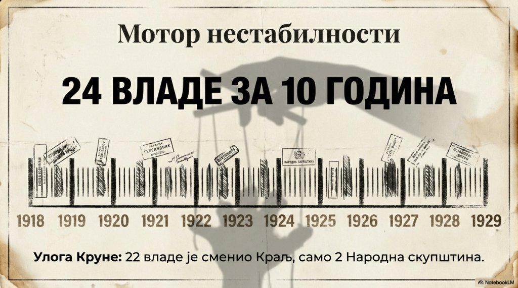 У периоду до 1929. године од 24 владе 22 је оборио краљ, а само 2 су изгубиле поверење Народне скупштине, што сведочи да је иза званичног парламентаризма стајала ауторитативност краљеве воље, али то је било у складу са Видовданским уставом. Краљ је на водеће српске странке утицао и преко себи блиских људи у њима. Владајуће странке су рачунале и на полицијски притисак на бираче пред изборе и прилагођавање изборног законодавства својим потребама. Ниједна влада до 1929. није издржала пун мандат. Главно политичко питање било је национално питање. Већ на другим изборима (1923) било је приметно јачање странака са израженим националним обележјем, насупрот оним са југословенским програмом (Демократска странка, која је једина имала кандидате у свим окрузима, и Савез земљорадника). Врхунац кризе парламентаризма било је убиство хрватских посланика (два убијена, три рањена) у скупштини 20. јуна 1928. године од стране радикалског посланика из Црне Горе. Неколико дана касније од последица рањавања преминуо је и вођа Хрвата Стјепан Радић.