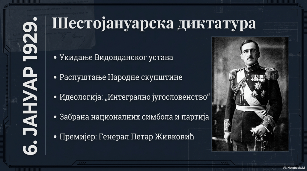 У „Прокламацији“ од 6. јануара 1929. године краљ Александар Карађорђевић је парламентаризам означио појавом која „почиње да доводи до духовног расула и народног разједињења“. За највиши циљ своје владавине и највећи закон земље суверен је означио народно јединство и државну целину. Услед парламентарне кризе 1929. године, након атентата у скупштини, краљ је укинуо устав, распустио Народну скупштину и завео диктатуру са циљем да сачува државу и створи јединствени југословенски национални идентитет.