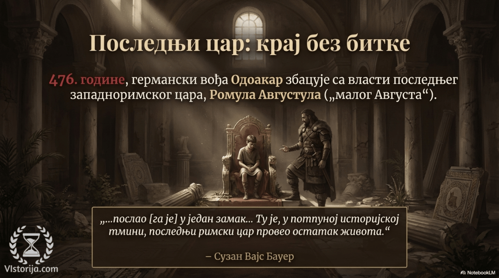 Последњи западни римски цар је био Ромул, од поданика прозван Августул, односно „мали Август“. Њега су са власти збацили германски војници које је унајмило Западно римско царство.