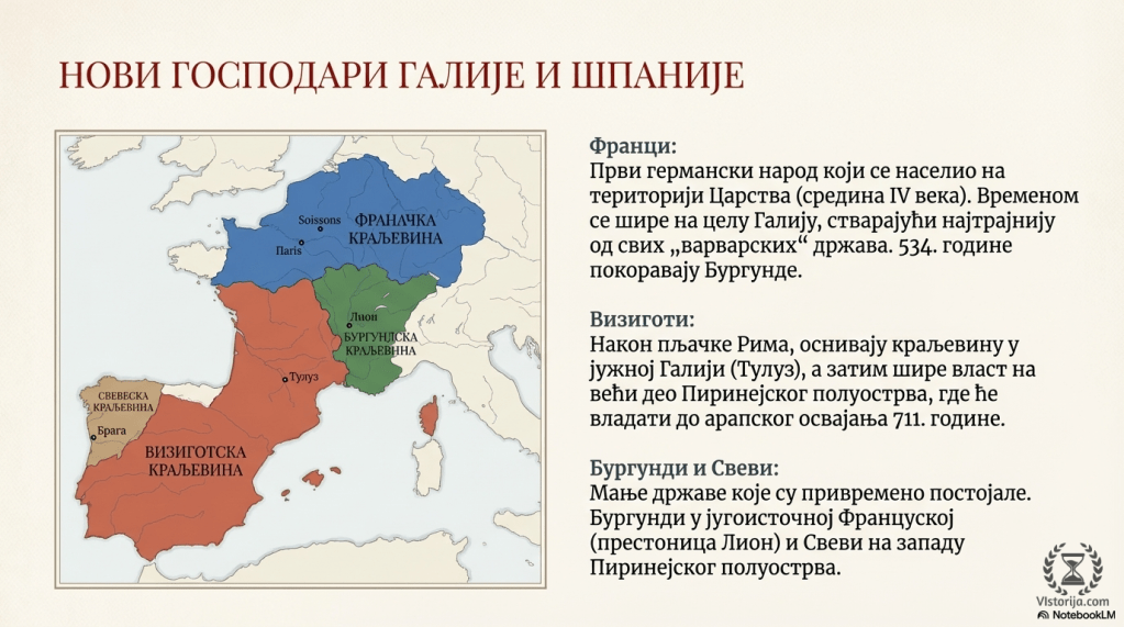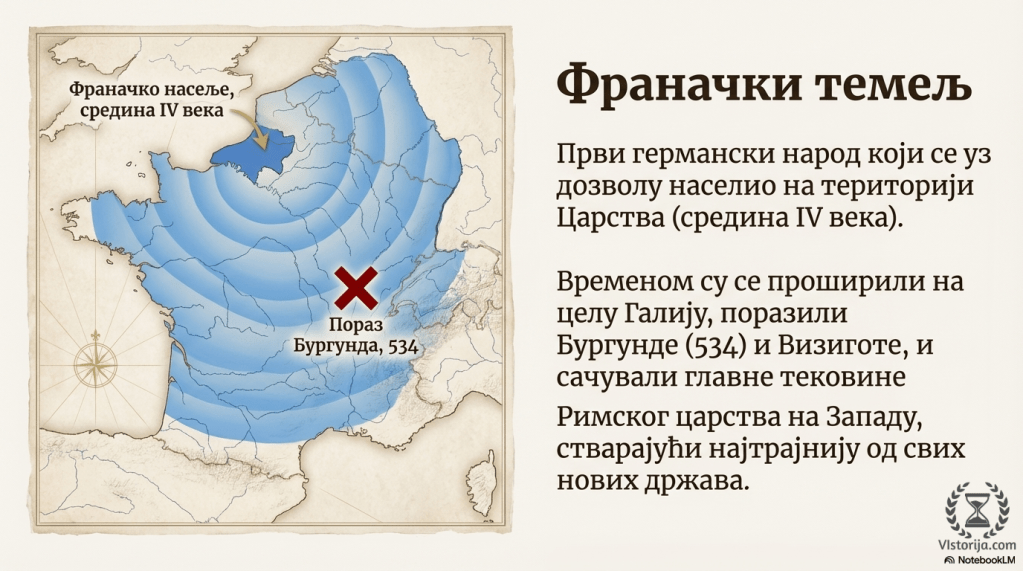 Франци су били први германски народ који је добио дозволу да се настани на територији Римског царства. Настанили су се у северном делу Галије (у деловима данашњих држава Холандије и Белгије) средином IV века, а временом су се проширили на целу Галију. Освајајући Галију Франци су 534. године поразили државу које је средином V века било основало племе Бургунди на простору данашње југоисточне Француске без приобалног дела, са престоницом у Лиону. Овај народ је сачувао главне тековине Римског царства на Западу.
