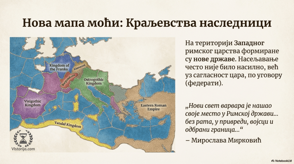 „На територији Западног римског царства формиране су нове државе: Бургундско и Франачко краљевство, држава Визигота у Галији и Вандала у северној Африци и Остроготско краљевство у Италији; на Истоку је краткотрајно постојало једино Гепидско краљевство у Панонији. Остроготи су ратом изборили право да се населе у Италији и ту су основали своје краљевство, Вандали су, када су се једном нашли у северној Африци, освајањем проширили своју област коју су ратом бранили од војних снага и Источног и Западног царства. У међувремену су склапали уговоре с царем у Равени. Неке од тих раних држава биле су ефемерна творевина, неке су основа средњовековних држава.