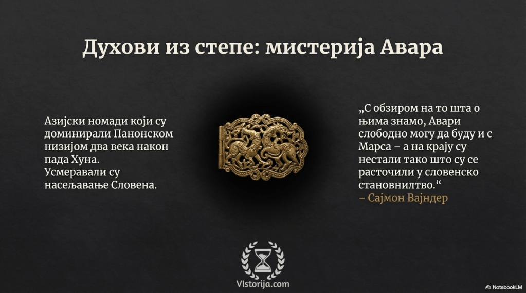 „Авари су били брзопокретни азијски номади оне заморне врсте која је позната свакоме ко је пробао да се скраси и заради поштен новац у централној Европи. Не знамо скоро апсолутно ништа о њима. Они су били на врхунцу када су заузели Константинопољ 626. године, али их су отерали Византинци, те су се они онда населили у широком појасу од Чешке до Бугарске. Аварски каганат на много начина илуструје зашто је мрачни средњи век тако иритантан – Авари се могу назрети у хроникама или на неколико преживелих декоративних предмета потпуно лишених контекста, иако су два века били главни сизерени, који су усмеравали насељавање Словена у централној Европи. Аварски амбасадор срео се с Карлом Великим на његовом двору на Рајни 790, године и договорили су границу између франачког и аварског царства, али то је очигледно било само примирје. Франци су поразили Аваре у катаклизмичкој бици која је позната по хрпама злата које је уручено пријатељима Карла Великог, што је било значајно померање злата са истока на запад, који је дуго био гологуз. Постоји последње помињање Авара у хроници из 822. године, али од тада име једноставно нестаје из писаних извора. Волео бих да имам неки наговештај како је аварски амбасадор који је разговарао с Карлом Великим заправо изгледао – ми чак не знамо ни који је језик користио, нити како се облачио. С обзиром на то шта о њима знамо, Авари слободно могу да буду и с Марса – а на крају су нестали тако што су се расточили у словенско становништво.“