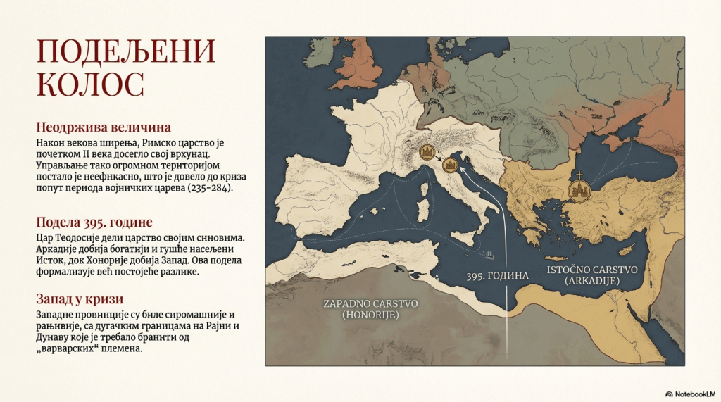 Римска држава (753) се од града-државе проширила (од почетка V века пре н.е.) на читаву територију Апенинског полуострва (265) и читаву обалу Средоземног мора (30), а највећи обим Римско царство је досегло почетком II века н.е. Да државна организација није довољно ефикасна за тако велико царство указивао је период војничких царева (235-284) и увођење тетрархије (284), која је окончана новим грађанским ратовима. Царство је 395. године поделио цар Теодосије својим синовима. Старији син Аркадије је добио источни део царства и тиме је наглашен његов већи значај, као када су у том делу царства своје престонице изабрали цареви Диоклецијан (284-305) и Константин (306-337). Источне провинције су биле гушће насељене и богатије од западних.
