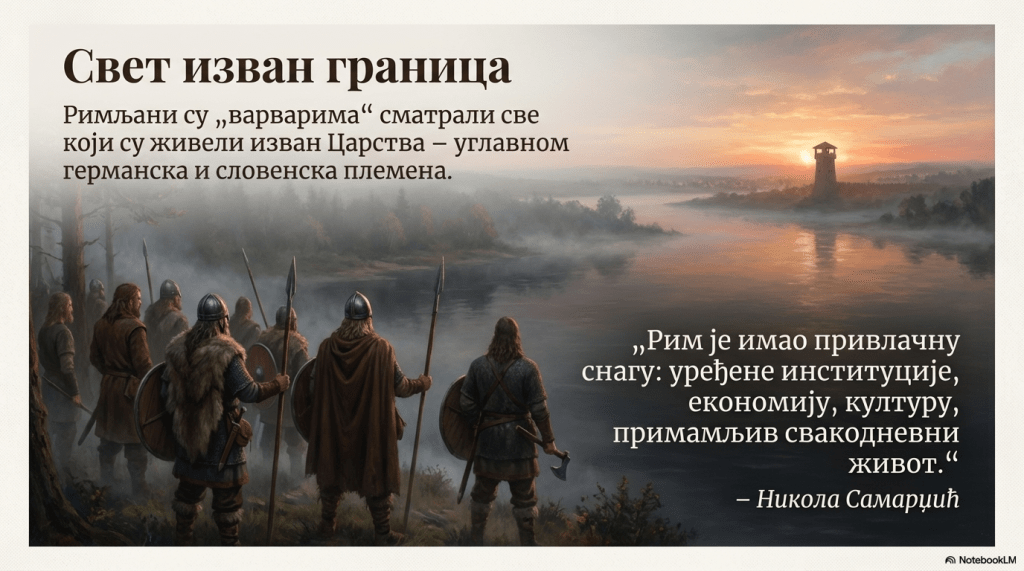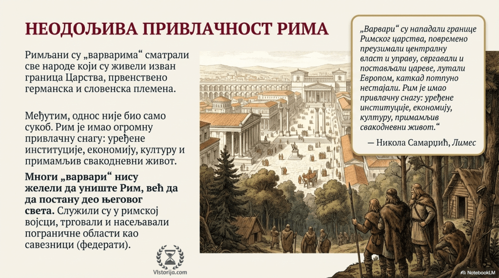 ,,Варвари“ су нападали границе Римског царства, повремено преузимали централну власт и управу, свргавали и постављали цареве, лутали Европом, каткад потпуно нестајали. Рим је имао привлачну снагу: уређене институције, економију, културу, примамљив свакодневни живот.