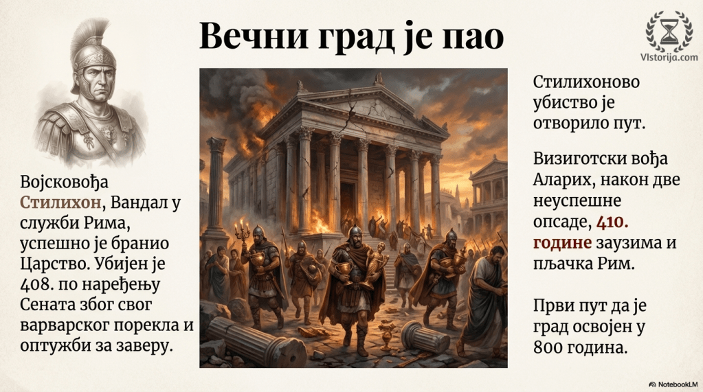 Западним римским царством је од поделе 395. уместо малолетног цара Хонорија управљао војсковођа Стилихон, који је био припадник германског племена Вандала. Његово варварско порекло сметало је представницима аристократије, окупљенима у Сенату. Иако је бранио Рим од упада варвара, римска аристократија га је оптужила за заверу са варварима у циљу да на престо дође његов син и поврати паганство. Прогласили су га издајником и убили 408. године. То је искористило германско племе Визиготи, који су предвођени војсковођом Аларихом опседали Рим. Од прве опсаде Аларих је одустао када су му испунили захтев да се ослободе сви робови варварског порекла и преда му се сво злато и сребро из града. Други пут је одустао од опсаде када су му римске власти препустиле три провинције и обавезали се на плаћање годишњег данка. Након треће опсаде је 410. године заузео Рим. Тада је Рим први пут освојен од варвара још од оснивања града. После смрти свога вође Алариха Визиготи су напустили Италију.