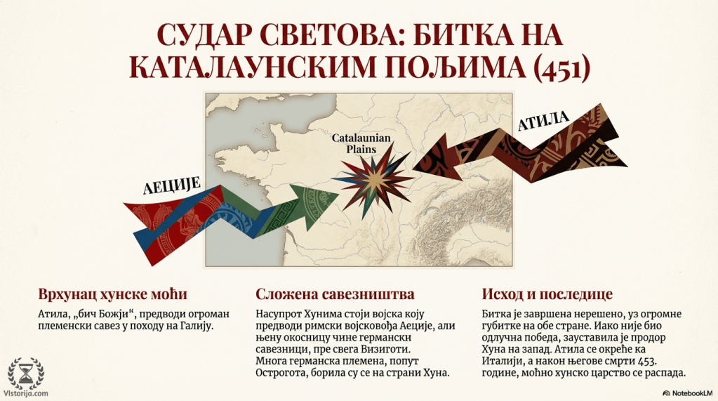 Хуни су били дивљи номади монголског порекла, који су 375. године прешли из Азије у Европу. Опустошили су римске провинције Панонију, Мезију и Тракију. Продор Хуна на запад заустављен је 451. године у бици на Каталаунским пољима у Галији. Са обе стране су се борили бројна германска племена, као савезници потчињени Римском царству или хунском племенском савезу. Битка је завршена нерешено и после ње Хуни више нису ишли на запад него на југ, ка Италији. Када је 453. умро хунски предводник Атила држава која се простирала од Алпа до Урала се распала.