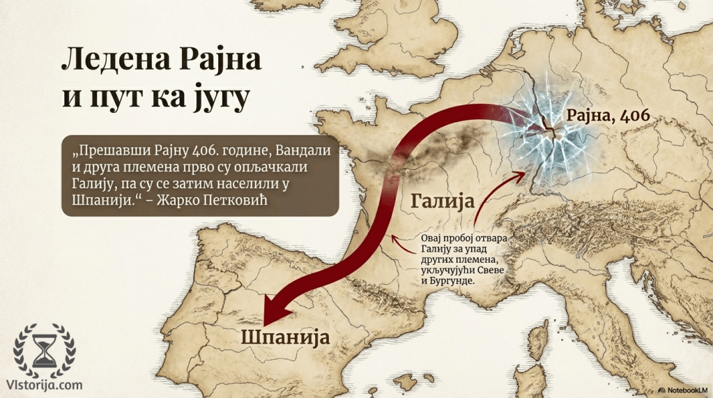 „Прешавши Рајну 406. године, Вандали и друга племена прво су опљачкали Галију, па су се затим населили у Шпанији. Потом, пошто су били изложени нападима Визогота, који су деловали по римским инструкцијама, Вандали су под вођством Гејзериха прешли у Африку 429. године и десет година касније освојили су Картагину, пресекавши приходе Западног царства из тог дела света. Гејзерих је био први германски владар који је организовао флоту и успешно се бранио од покушаја источних царева да униште његову државу. Вандалска држава је пресекла Медитеран на два дела. Тако је окончано, након отприлике 600 година, политичко јединство Медитерана, остварено у оквирима Римске државе још средином ІІ века пре Христа.“