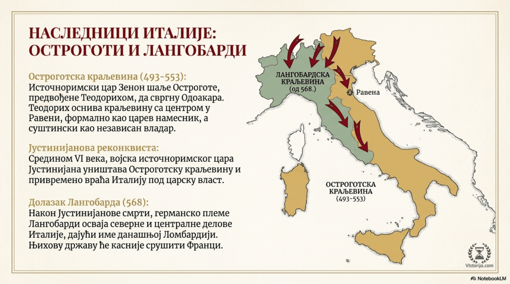 Одоакар је у Риму основао своју краљевину под врховном влашћу источноримског цара. Због његовог осамостаљивања од цариградског двора цар Зенон је послао на Италију војску германског племена Острогота, који су били савезници царства у Панонији, након ослобођења од хунског савеза после Атилине смрти. Цар Зенон је на тај начин намеравао да са истока уклони опасног предводника Острогота Теодориха. Када је стигао у Италију Теодорих се договорио са Одоакаром о подели Италије, али је само неколико дана касније издао споразум, убио Одоакара и завладао Италијом, којом ће Остроготи владати од 493. до 553/5. године.