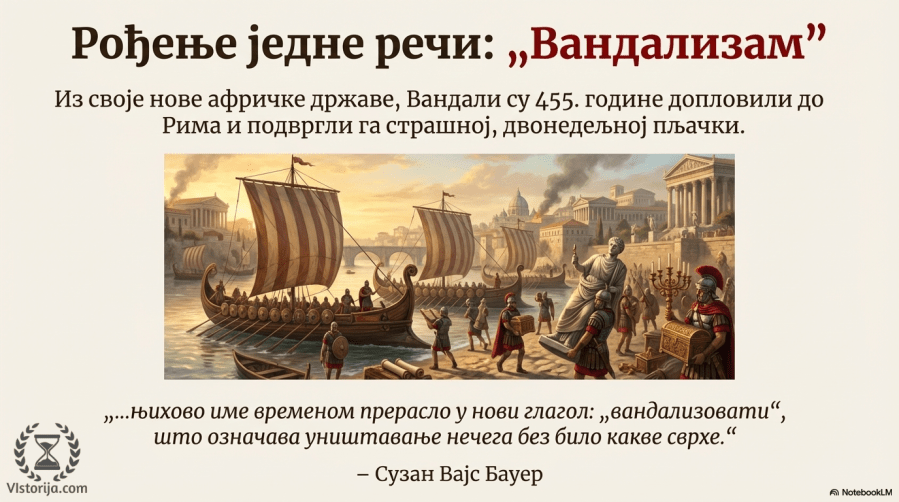 „Током наредних четрнаест дана северноафрички варвари тумарали су градом који су темељно пљачкали, па је њихово име временом прерасло у нови глагол: „вандализовати“, што означава уништавање нечега без било какве сврхе.“