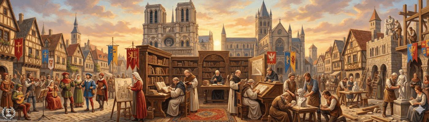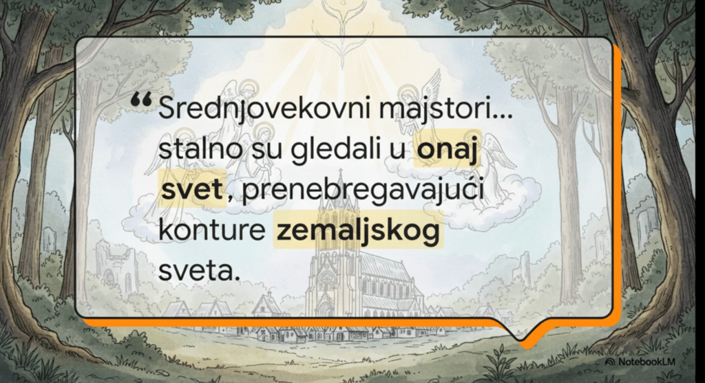 “Ако занемаримо систем вредности који се налази у основи поимања света средњовековних људи, онда не можемо да разумемо ни њихову културу. У то доба најраспрострањенији и најпопуларнији жанр књижевних дела била су житија светаца, најтипичнији образац архитектуре – катедрала, у сликарству доминира икона, у скулптури – личност из Библије. Средњовековни мајстори, писци и уметници, стално су гледали у онај свет, пренебрегавајући видљиве контуре земаљског света. (…) Уметници скоро у потпуности заобилазе природу, не описују пејзаже, не примећују особености појединих људи, не обраћају пажњу на разлике у животу људи у различитим земљама. Они индивидуализацију претпостављају типизацији; уместо да проникну у разноврсне појаве из живота, они полазе од непомирљивих супротности узвишеног и приземног, поларизујући апсолутно добро и апсолутно зло.”