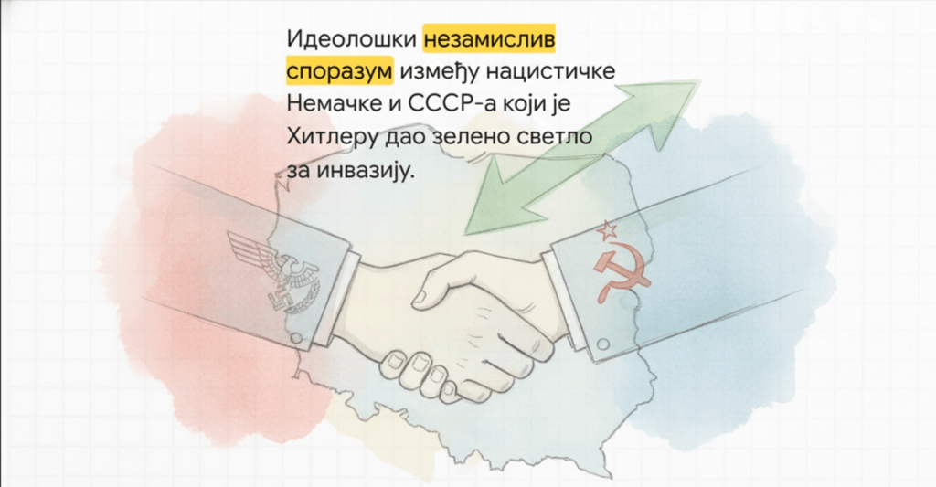Августа 1939. Немачка је са СССР-ом потписала јавни споразум (назван Рибентроп-Молотов, по министрима спољних послова, који су га потписали) о ненападању и тајни о подели интересних сфера у Пољској и препуштању балтичких земаља (Естонија, Летонија, Литванија) СССР-у.