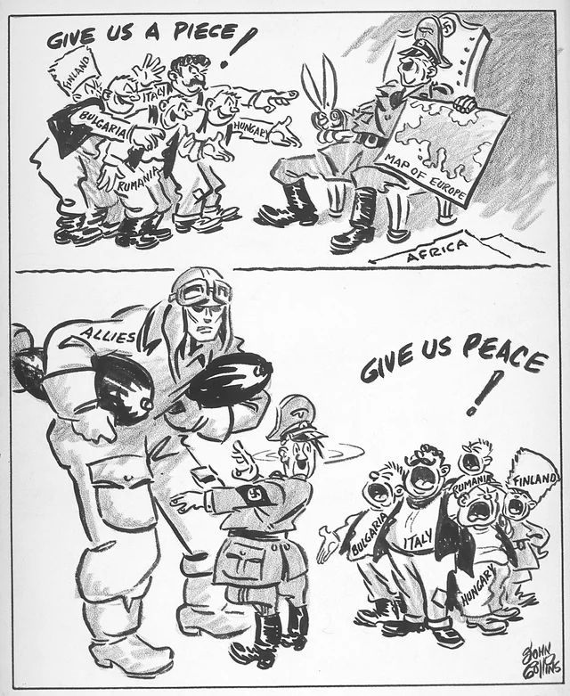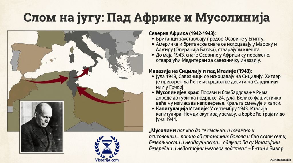 У септембру 1943. године краљ Италије је сменио Мусолинија и Италија је капитулирала. Борбе у Италији, Британаца и Американаца против италијанских фашиста и Немаца, трајале су до јуна 1944. године.