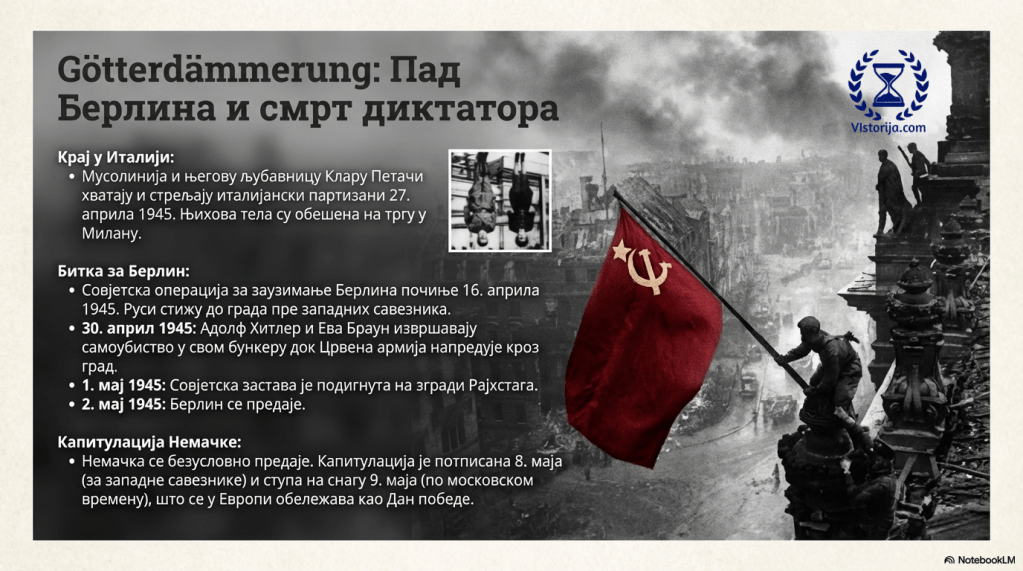 Три дана касније (30. априла 1945. године) убио се Хитлер. Руси су стигли до Берлина пре војске западних савезника. Заузимање Берлина је завршено 2. маја, а операција је започела 16. априла. Совјетска застава се завијорила на згради немачког парламента 1. маја.