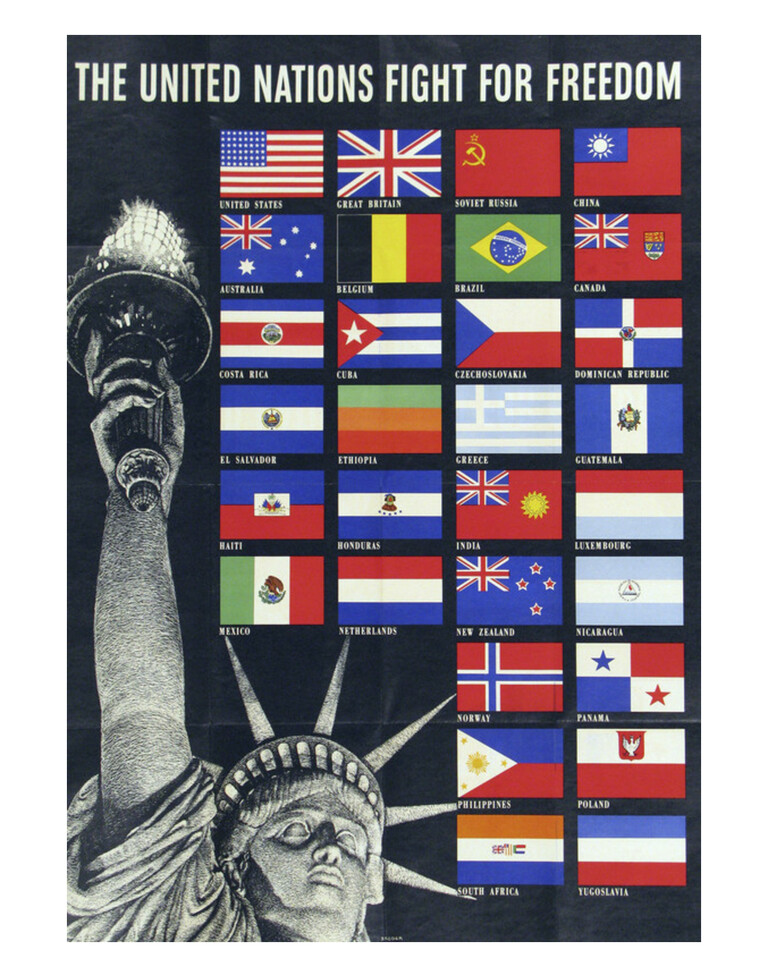 „Уједињене нације се боре за слободу“ — амерички плакат из Другог светског рата (око 1942-1943) који приказује Кип слободе поред савезничких застава.