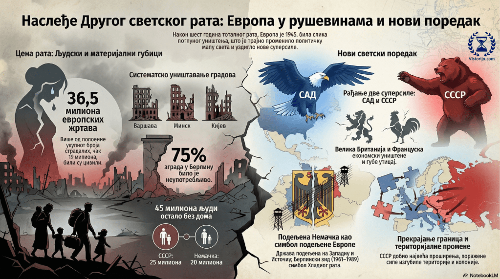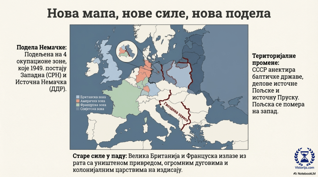 Велика Британија и Француска су на крају рата третиране као велике силе, али објективно оне то више нису биле. Из рата су изашле са разореним територијама, уништеном привредом и великим ратним дуговима. Њихово колонијално царство је почело да се распада. САД су из рата изашле као једина нуклеарна сила, а СССР са најмногољуднијом војском. САД су биле у бољем економском положају, јер се рат није водио на њиховој територији, па нису претрпеле разарања, имале су и много мање људских жртава.