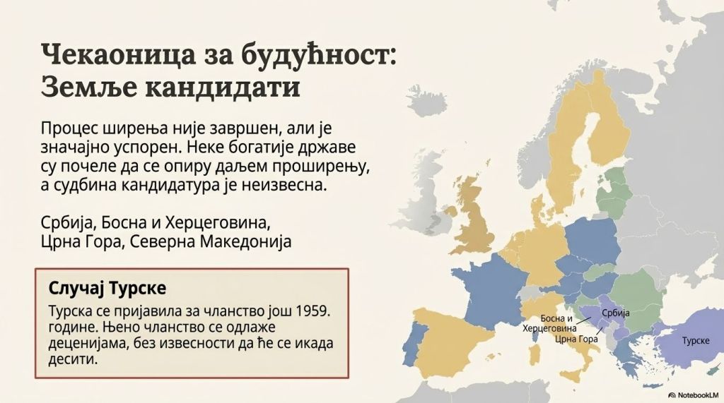 Још има држава кандидата за чланство у ЕУ, међу којима је и Србија, а осим ње још суседне Босна и Херцеговина, Црна Гора, Северна Македонија, Албанија и Турска, чије се чланство одлаже деценијама, без извесности да ће се икада десити.
