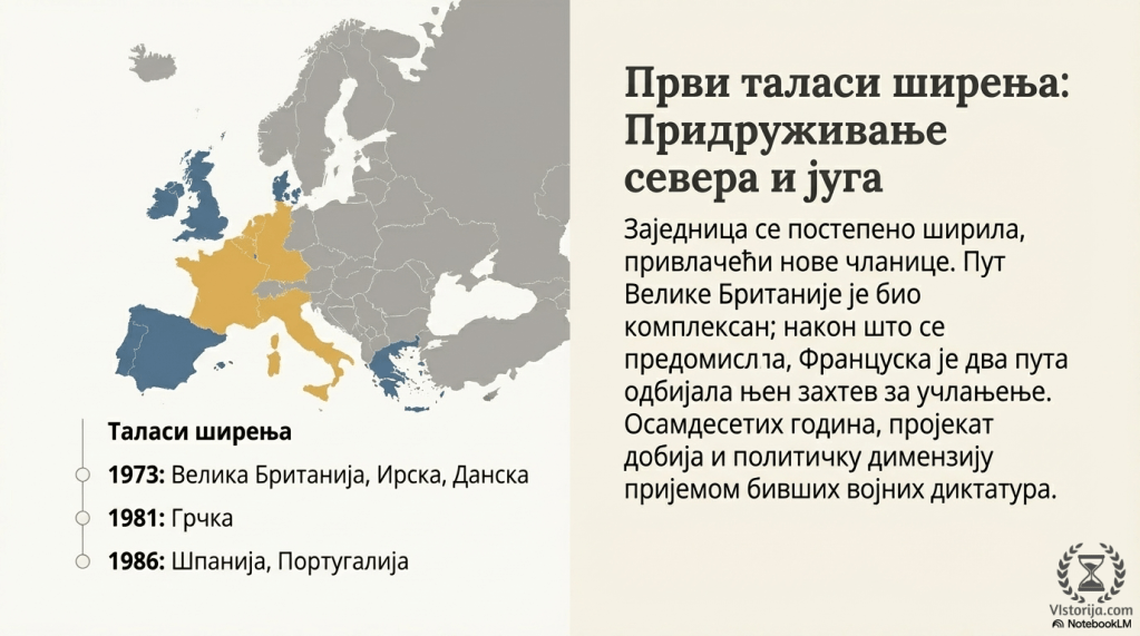 Ирска и Данска су се придружиле 1973. године, а некадашње војне диктатуре из јужне Европе осамдесетих: Грчка 1981, те Шпанија и Португалија 1986. године).