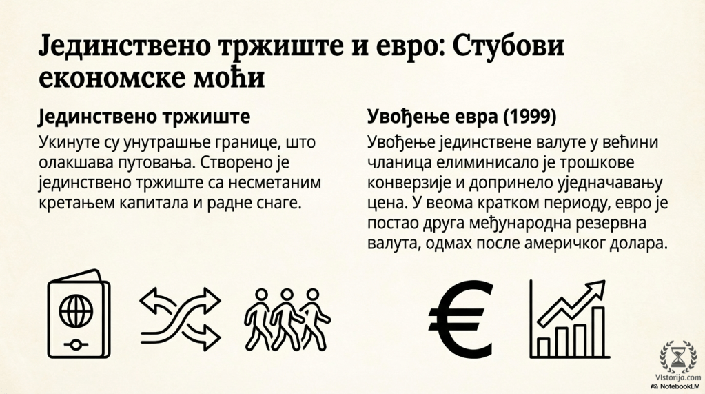 У Европској унији су укинуте унутрашње границе, што је олакшало путовања, а ствара се и јединствено тржиште, са несметаним кретањем капитала и радне снаге. Стварању јединственог тржишта допринело је и увођење евра 1999. године као јединствене европске валуте у већини чланица. Тиме су елиминисани трошкови промена валута и учињен је значајан корак ка уједначавању цена. У веома кратком периоду евро је постао друга међународна резервна валута, одмах после америчког долара.