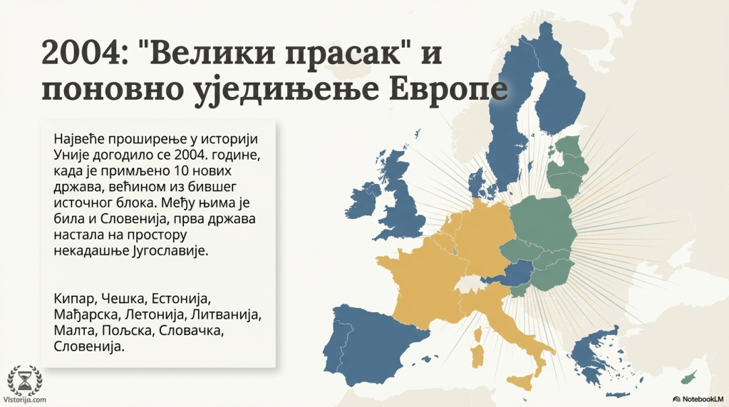 Највеће проширење Европске уније је било 2004. године, када је примљено 10 нових држава које су раније биле у оквиру источног блока или покрета несврстаних (међу њима и једна држава настала на простору некадашње Југославије – Словенија).