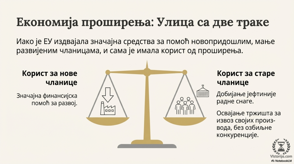 Европска унија је значајна средства издвајала за помоћ новопридошлим, мање развијеним чланицама, али је и сама имала корист од тога, јер је придруживањем добијала јефтинију радну снагу и тржиште за извоз својих производа, одакле није добијала озбиљну конкуренцију.