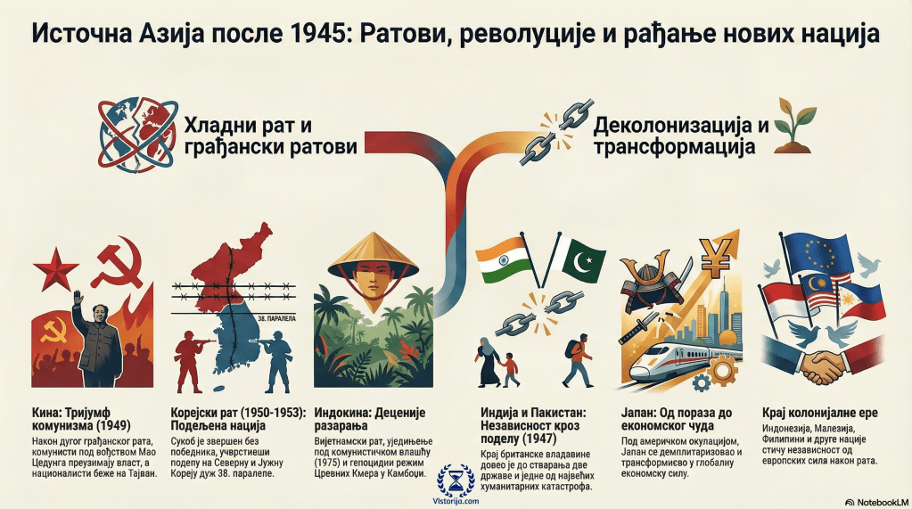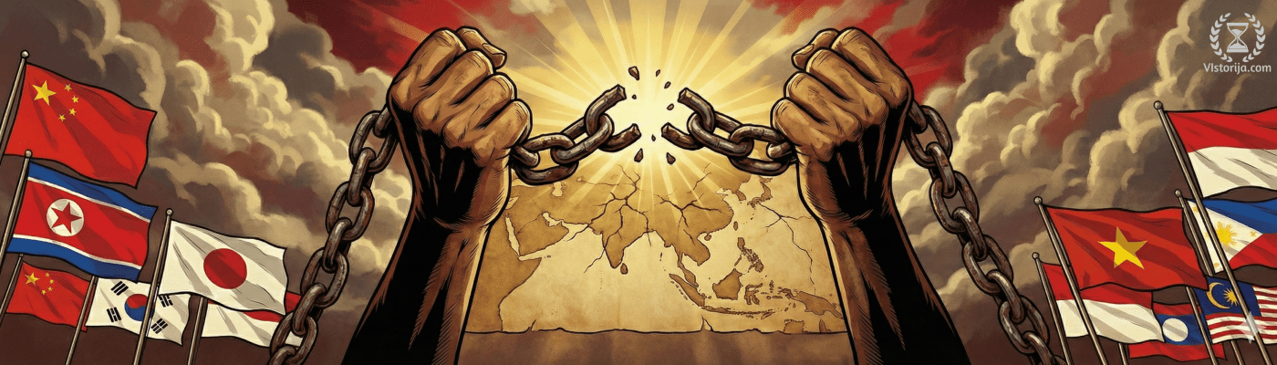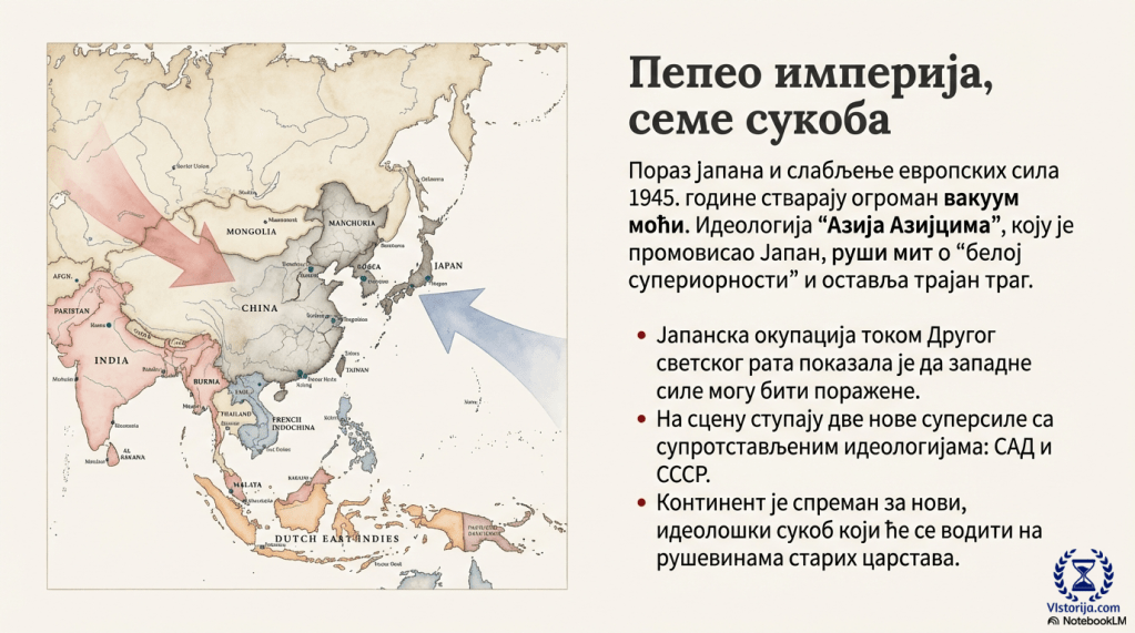 За процес деколонизације у Азији значајна је била јапанска експанзија током Другог светског рата, јер је Јапан срушио супериорност западних држава и показао како и они који нису припадници беле расе могу бити победници. Многи народи у источној Азији су прихватили јапанску идеологију Азија азијским народима, па су чак и јапанску окупацију видели као ослобођење, барем у почетку. Јапан се после рата нашао под окупацијом САД-а, које су затим развиле Јапан као свог партнера у борби против ширења комунизма у том делу света.