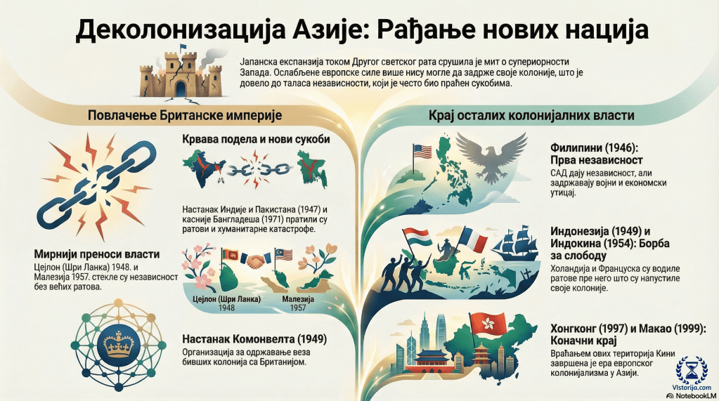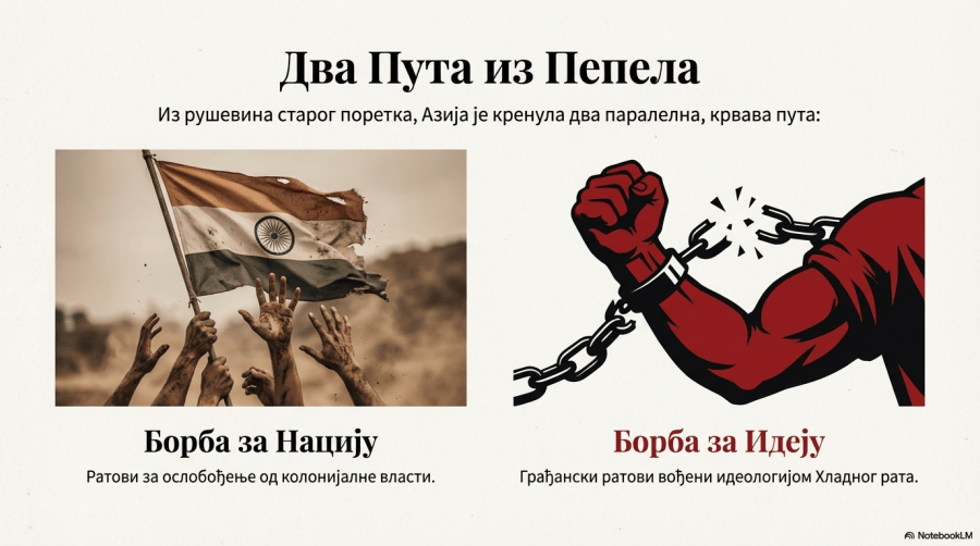 Други светски рат се у Азији показао и као антиколонијални рат. У борбама су ојачали национални покрети, а колоније су за помоћ метрополама добиле разна обећања. То се посебно односило на Индију, која је у оба светска рата имала кључну улогу у снабдевању британске војске. Пре рата Индија је дуговала Британији, а после рата је било обрнуто. Та ситуација је приморала Британију на попуштање.