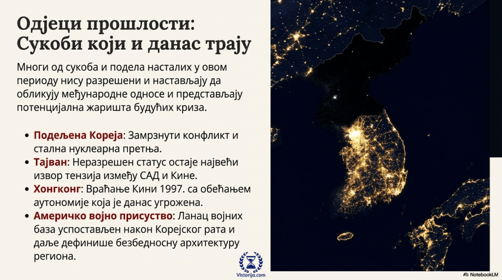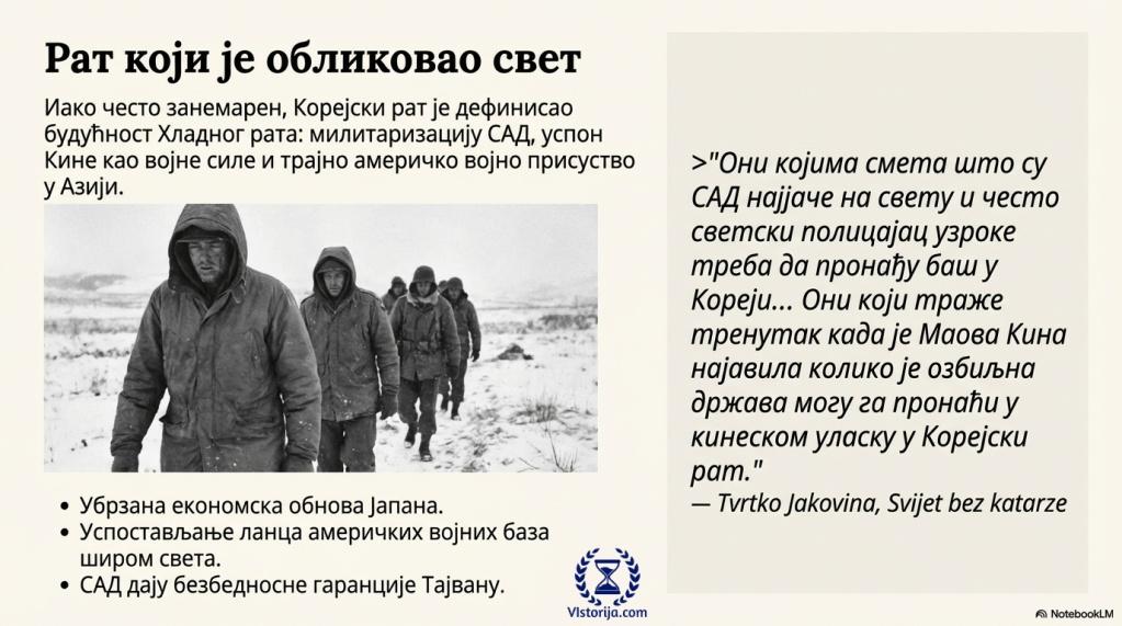 „За укупну историју човечанства, најважније је што су Сједињене Америчке Државе због Кореје убрзале привредну обнову Јапана, успоставиле ланац војних база по свету, зато што је крајем 1950. одобрен план Пола Ницеа, којим је вишеструко порасло издвајање за америчке војне снаге. Тајван је добио гаранције безбедности, Француска Индокина такође. Они којима смета што су САД најјаче на свету и често светски полицајац узроке треба да пронађу баш у Кореји, на рубу света, догађају који на човечанство утиче иако је заборављен чак и у Америци. Они који траже тренутак када је Маова Кина најавила колико је озбиљна држава могу га пронаћи у кинеском уласку у Корејски рат и победа на његовом почетку. Свет је то у којем живимо, у којем се удаљености бришу, а сличности препознају свуда.“