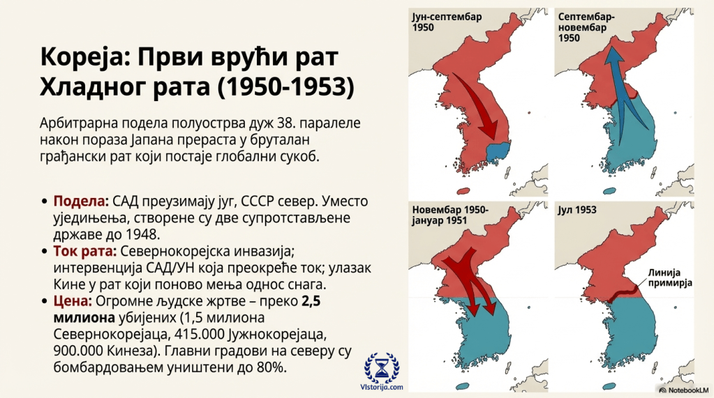 „Корејско полуострво је подељено за само неколико сати, одлуком америчких војника и дипломата средњег ранга и њихових совјетских колега, дан након што је на Нагасаки бачен плутонијумски „Дебељко“. […] Совјети се нису противили, па је 15. августа 1945. године почела подела нације и полуострва које има хиљадугодишњу свест о својој посебности, територији, култури, језику који је исти на северу и југу. Тачно три године касније, 15. августа 1948. године, у Сеулу је проглашена Република Кореја, са претензијама да влада целим полуострвом. Исто се догодило и у Пјонгјангу 9. септембра, када је Ким Ил Сунг постао шеф НДР Кореје. […]