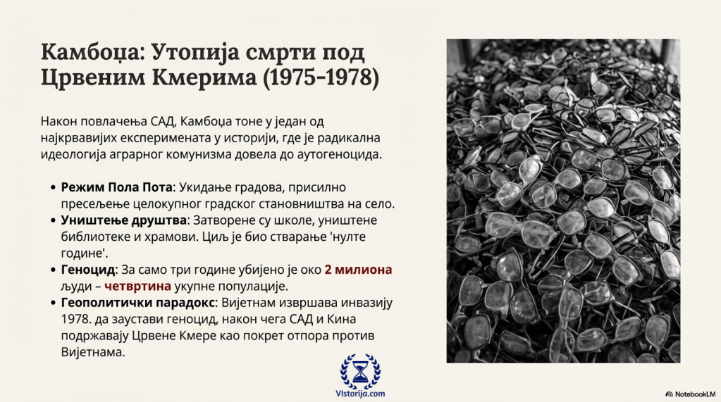 Камбоџа и Лаос су потпали под утицај Вијетнама. У Камбоџи су 1975. власт преузели Црвени Кмери (Кмери су најбројнија етничка заједница у земљи), срушивши проамеричку владу. Спроводили су аграрни комунизам. Највећи део градског становништва је присилно премештен на село. Уништене су библиотеке, школе и храмови. За 3 године убијено је око 2 милиона људи (од око 7,5 милиона становника). Режим вође Пола Пота се, како би спречио вијетнамску хегемонију, ослањао на Кину, насупрот СССР-а који је подржавао Вијетнам.