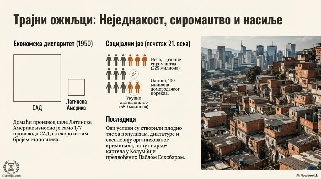 Латинска Америка се споро развијала. Домаћи производ целе Латинске Америке је 1950. године износио само 1/7 производа САД-а, док је број становника био скоро једнак. Почетком XXI века, по анализама УН-а, Латинска Америка је била део света са највећим социјалним разликама, тако да је 225 од 550 милиона становника живело испод границе сиромаштва. Од укупног броја сиромашних, чак 100 милиона је било индогеног (домородачког) порекла, што је био још један доказ снажних расних неједнакости. Због свега тога је Латинска Америка и на крају XX века остала континент са највише насиља.