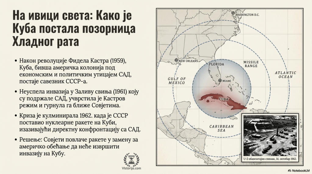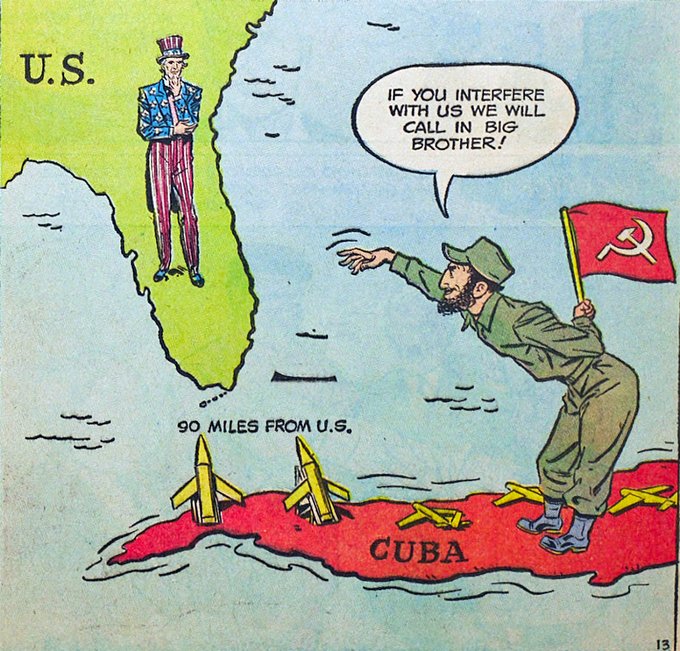 СССР је на Куби 1962. поставио своје ракете, пошто су претходно САД покушале инвазију на Кубу ради збацивања Кастра (бивши националиста који је као марксиста почео јасно да се изјашњава тек 1961. године) – искрцавање у Заливу свиња 1961. године (послате кубанске избеглице које су доживеле неуспех, јер је изостала очекивана подршка локалног становништва). Криза је завршена тако што су САД обећале СССР-у да неће дирати Кастра у замену за повлачење совјетских ракета.