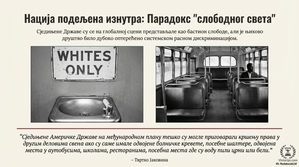 „Сједињене Америчке Државе на међународном плану тешко су могле приговарати кршењу права у другим деловима света ако су саме имале одвојене болничке кревете, посебне шалтере, одвојена места у аутобусима, школама, ресторанима, посебна места где су воду пили црни или бели.“