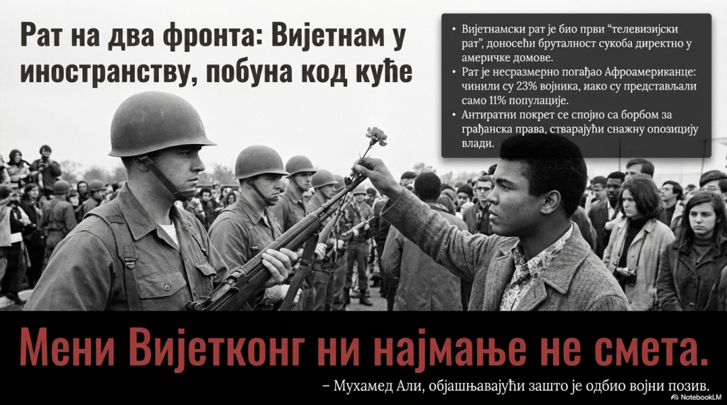 „Проблеме на вијетнамском ратишту почели су да прате и проблеми код куће. Већ од 1965. године јавно мњење у САД се све више окретало против рата. Од 1967. почели су масовни антиратни митинзи и студентски немири, које је радикализовала све шира ратна мобилизација студентске популације. Треба имати на уму да је један од разлога који је допринео великом антиратном расположењу и чињеница да је Вијетнамски рат био први рат са сталним телевизијским праћењем. Мартин Лутер Кинг и остале вође су почели отворено да критикују рат у Вијетнаму. Афроамериканце је посебно погађао овај рат, јер су они чинили 23% америчких војника у Вијетнаму, иако их је у САД било 11%. Следећи пример [боксера] Мухамеда Алија, који је одбио војни позив речима: „Мени Вијетконг ни најмање не смета“, многи црнци су одбили да оду у Вијетнам.“