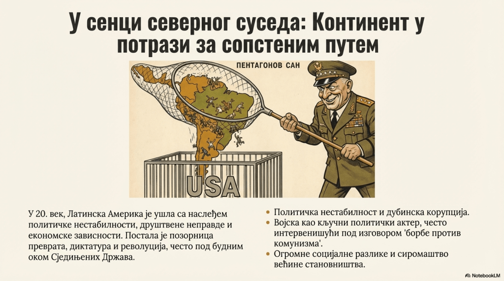 Латинска Америка је у двадесети век унeла наслеђе политичке нестабилности и друштвене непокретљивости. Постала је позорница грађанских ратова, преврата, удара, политичких убистава, војних диктатура, друштвене, расне и економске неправде. Шпански и португалски колонијализам препустили су сав утицај богатим земљопоседницима, који су подршку тражили у католичкој цркви и војној касти. Већина становништва је била сиромашна и необразована. Број становника је брзо растао.