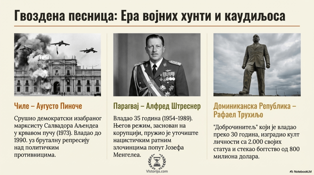 Тако је у Чилеу, 11. септембра 1973. године, војска бомбардовала председништво и преузела власт од председника Салвадора Аљендеа, који је 1970. године постао први марксиста који је на власт дошао демократским путем избора. Аљенде је пронађен мртав, а Августо Пиноче је био генерал који се 1974. прогласио председником и владао Чилеом као диктатор до 1990. године, након што је у децембру 1989. године изабран нови председник.