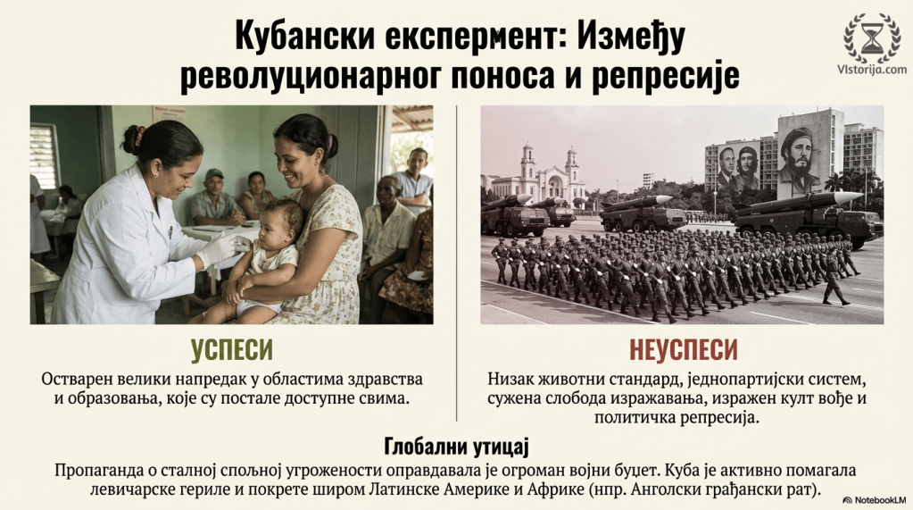 Куба је остварила велики напредак у здравству и образовању, али у многим областима напретка није било, па је стандард становништва остао на ниском нивоу. Режим је био једнопартијски са суженом слободом изражавања и израженом улогом вође. Председник Кастро је приграбио више функција, а на месту број два налазио се његов брат Раул, који га је наследио на месту председника Кубе 2008. године. У земљи је владала политичка репресија. Важан део политичке пропаганде било је стално јачање осећаја угрожености, што је омогућило импозантан војни буџет. Бројна војска омогућила је Кастру да помаже гериле у Латинској Америци и Африци, као у Анголском грађанском рату.