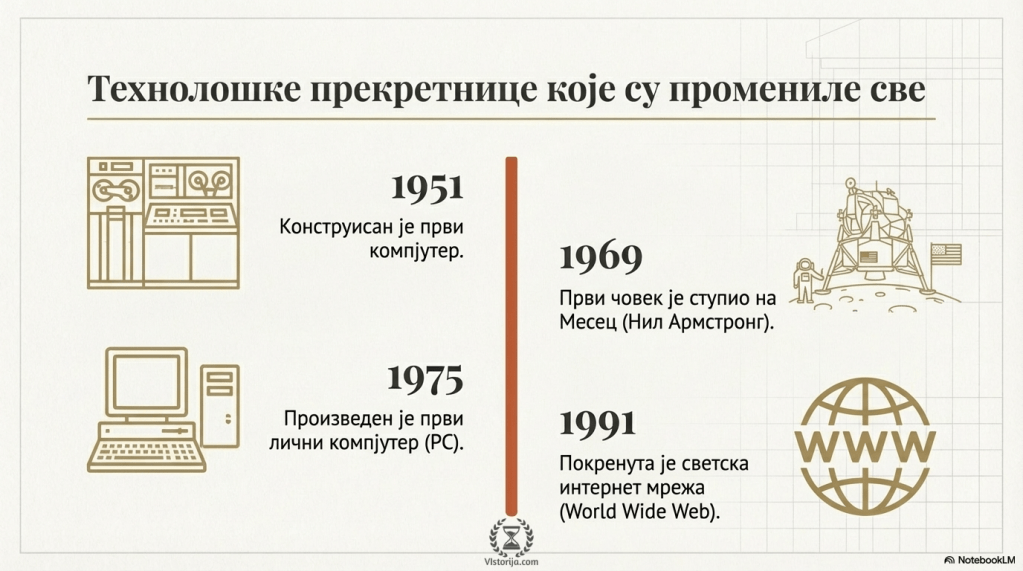 Први компјутер је конструисан 1951. године, а први лични компјутер произведен 1975. године. Светска интернет мрежа (www) покренута је 1991. године.