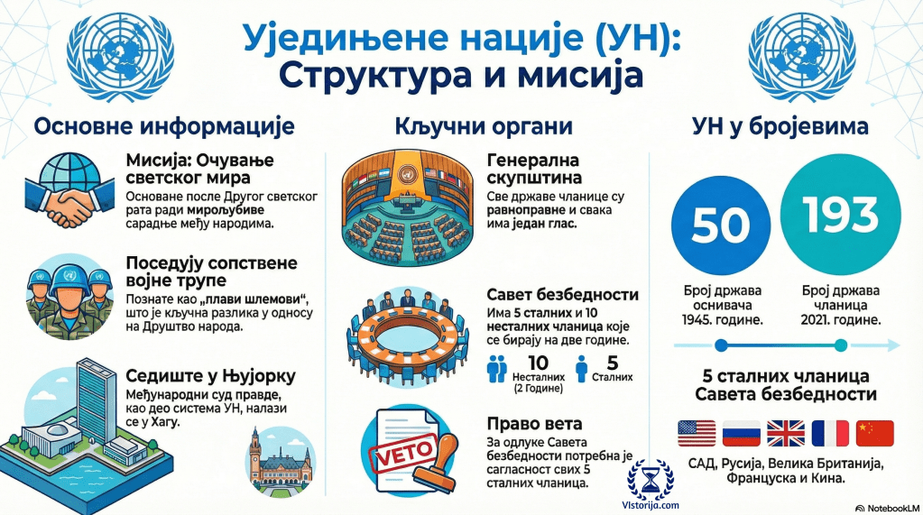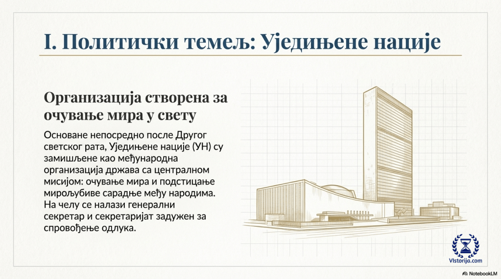 Организација Уједињених нација (УН) основана је после Другог светског рата, као међународна организација држава за очување мира у свету и мирољубиву сарадњу међу народима. На челу УН је генерални секретар и секретаријат који се баве решавањем проблема спровођењем изгласаних одлука.